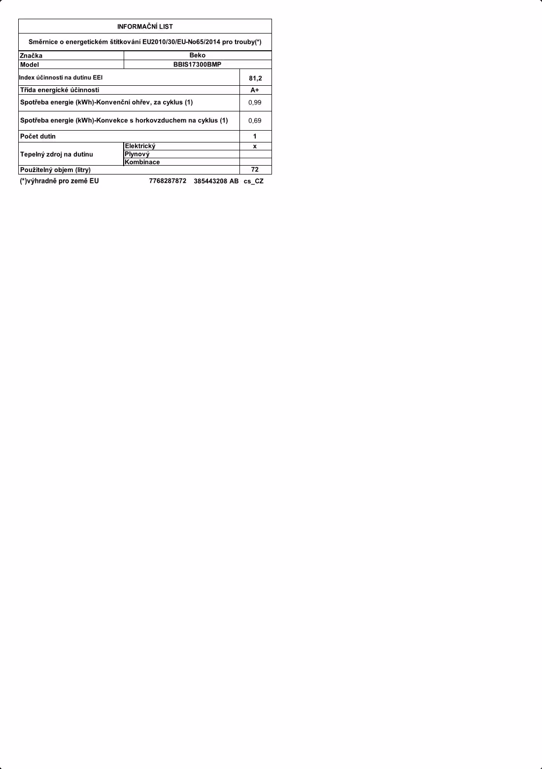 | Objem trouby L | 72 |